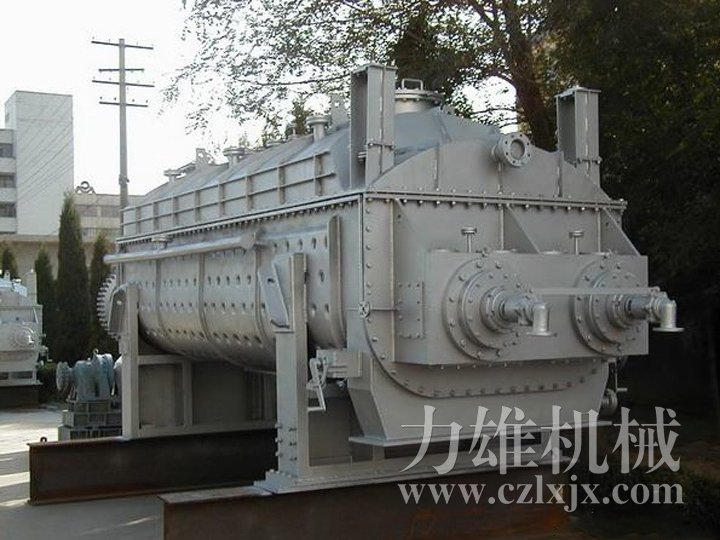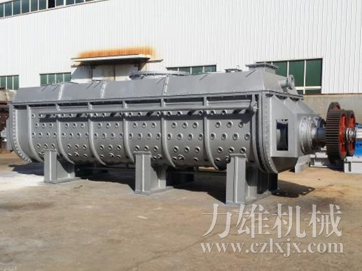 空心軸上密集排列著楔型中空槳葉,熱介質(zhì)經(jīng)空心軸流經(jīng)槳葉。單位有效容積內(nèi)傳熱面積很大,熱介質(zhì)溫度從-40℃到320℃,可以是水蒸汽,也可以是液體型:如熱水、導(dǎo)熱油等。間接傳導(dǎo)加熱,沒有攜帶空氣帶走熱量,熱量均用來加熱物料。熱量損失僅為通過器體保溫層向環(huán)境的散熱。楔型槳葉傳熱面具有自清潔功能。物料顆粒與楔型面的相對運動產(chǎn)生洗刷作用,能夠洗刷掉楔型面上附著物料,使運轉(zhuǎn)中一直保持著清潔的傳熱面。槳葉干燥機的殼體為Ω型,殼體內(nèi)一般安排二到四根空心攪拌軸。殼體有密封端蓋與上蓋,防止物料粉塵外泄而充分發(fā)揮作用。