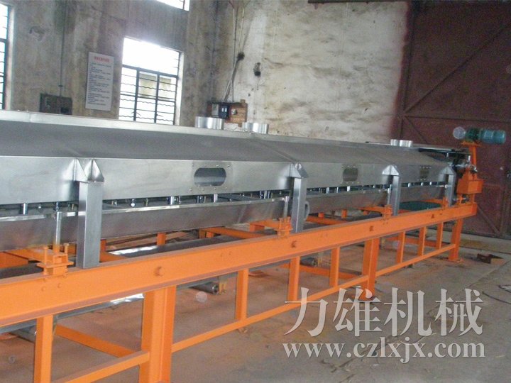 該機主要由落料模造粒成型機頭,冷卻輸送不銹鋼帶及帶輪、噴淋冷卻系統(tǒng)、傳動系統(tǒng)、保溫裝置、機架、刮刀等組成。落料模造粒機頭主要由機頭模套和機頭芯軸等組成。噴淋冷卻系統(tǒng)主要由噴頭、盛水池等組成。傳動系統(tǒng)主要由減速箱(減速器)調(diào)速電機等組成。